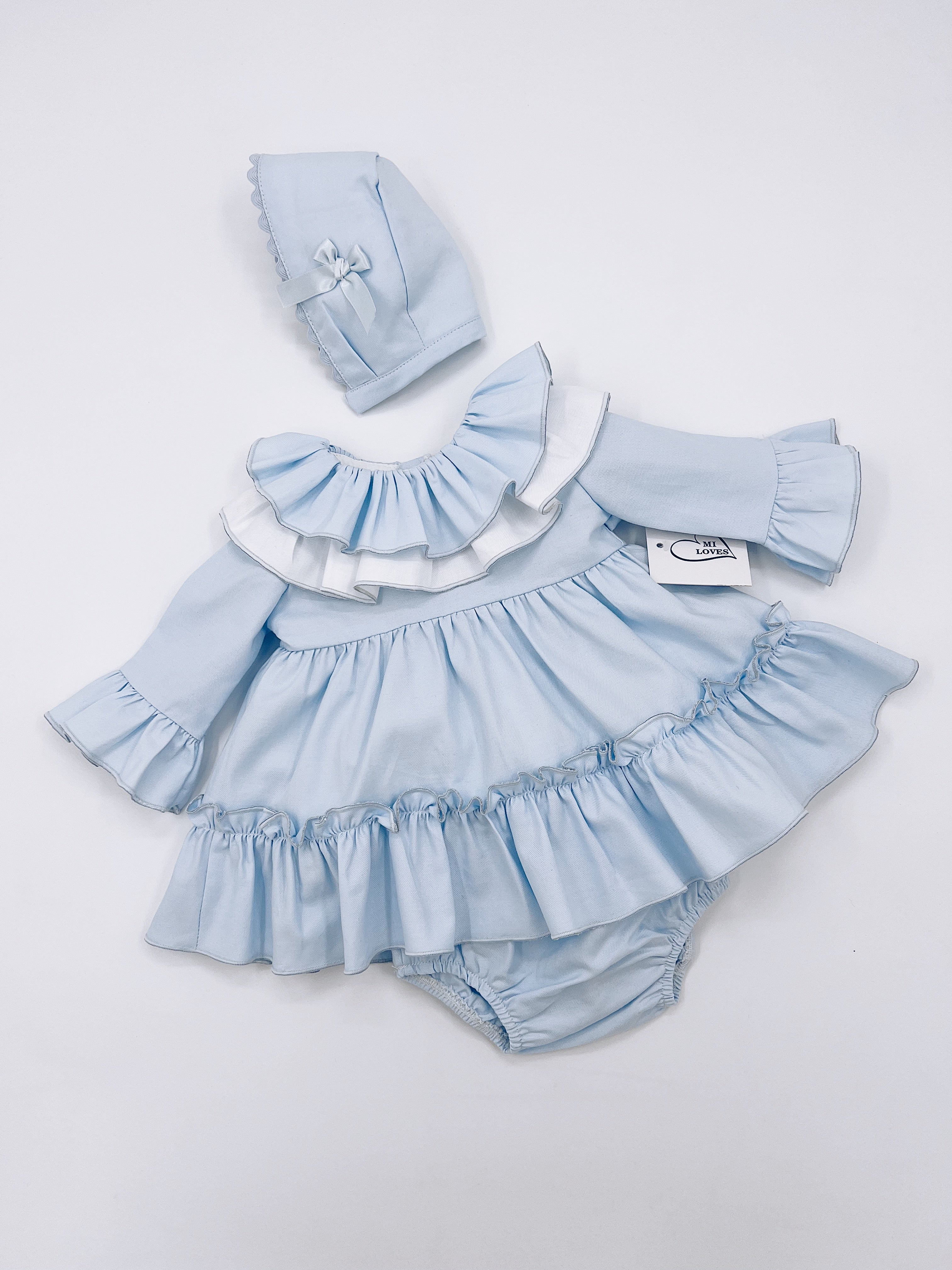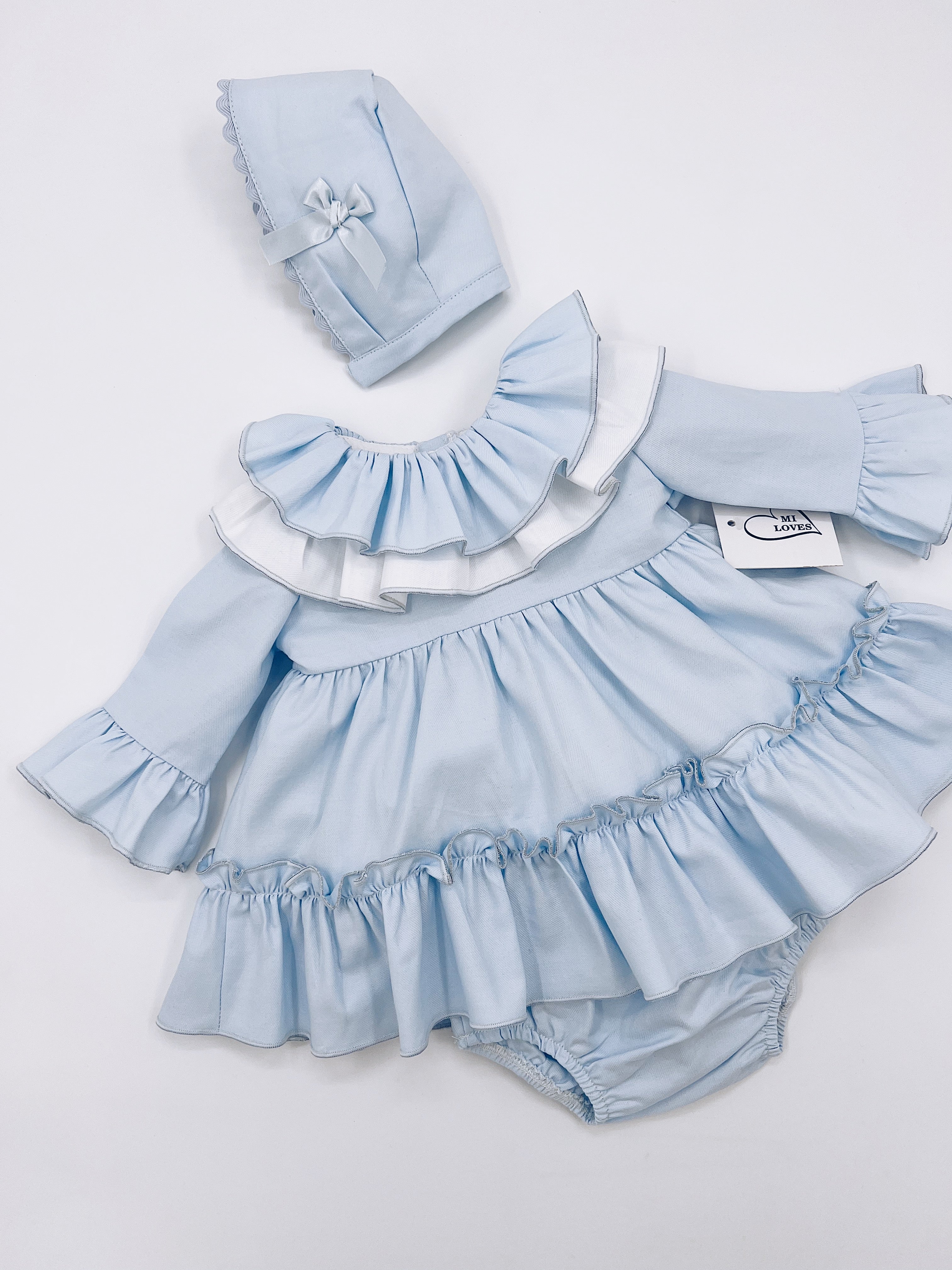 MI LOVES Baby Blue Dress/Bloomers/Bonnet 3 piece set