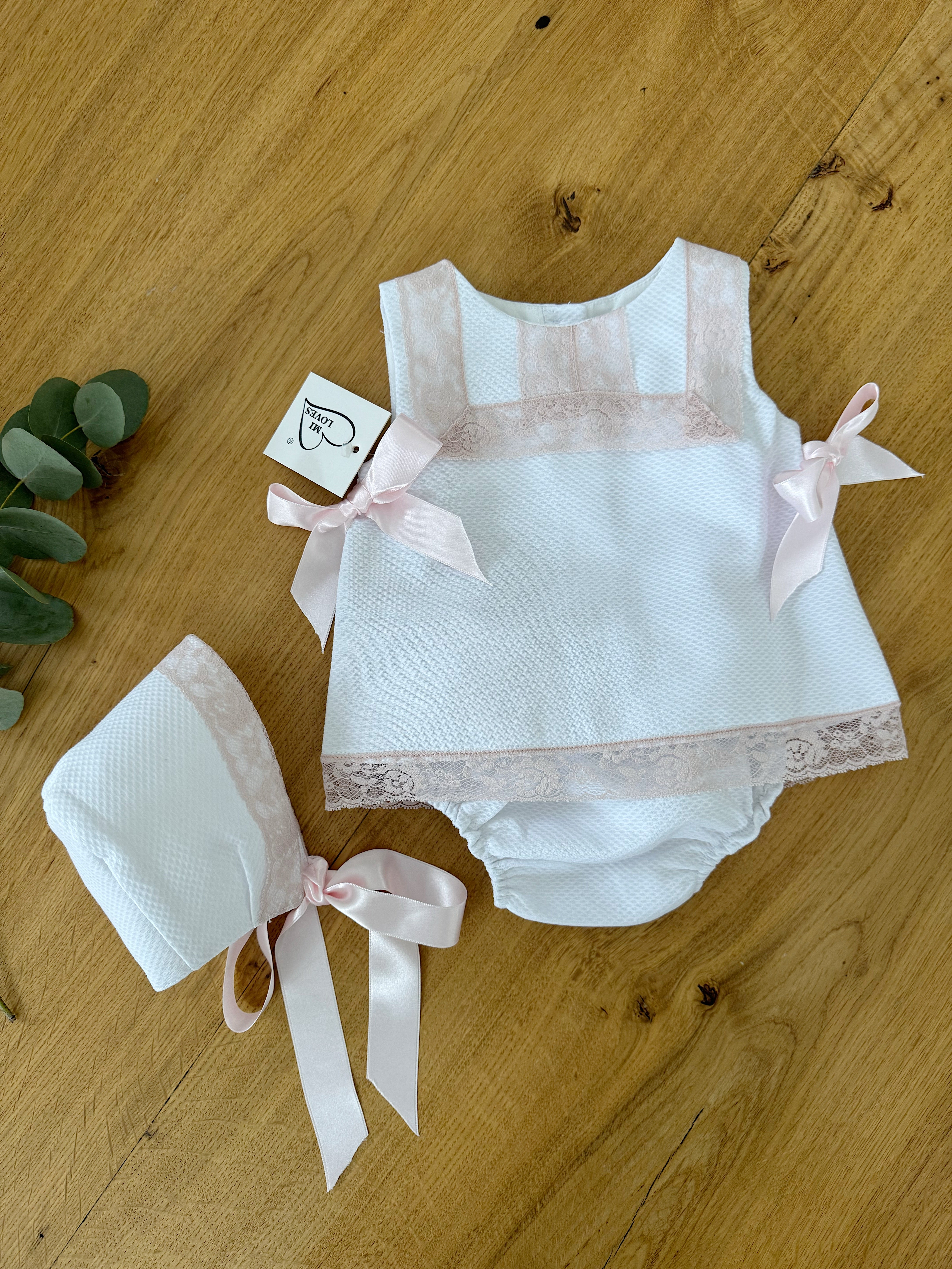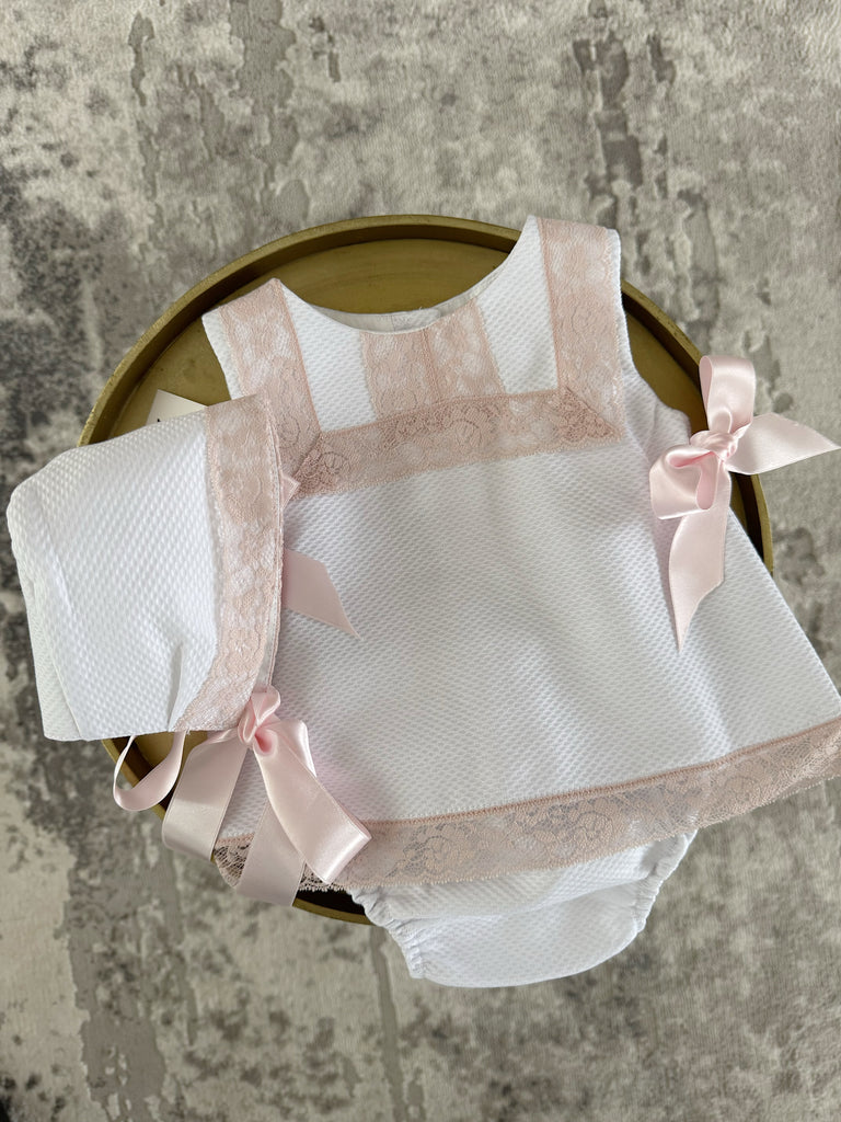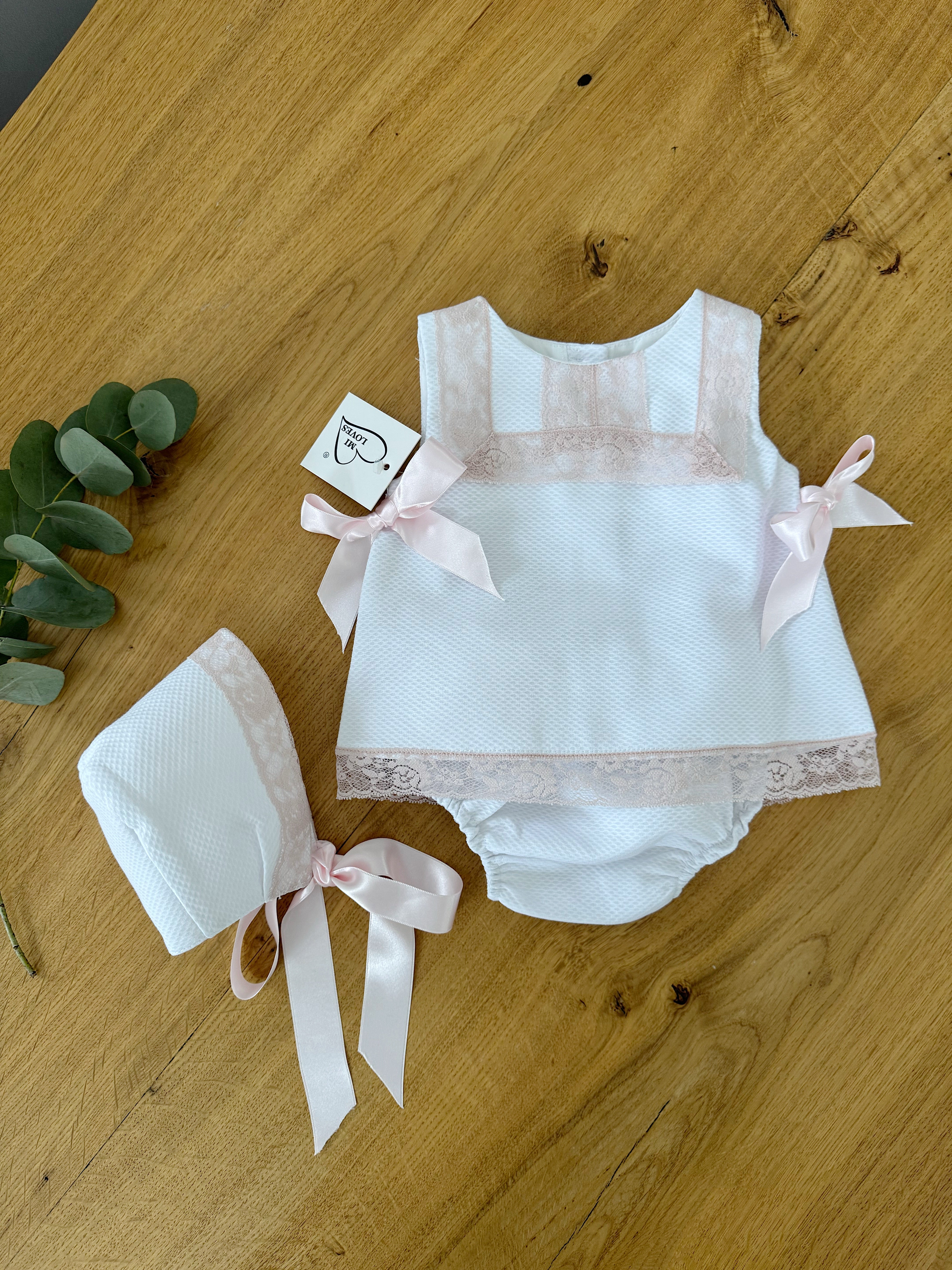 MI LOVES White Dress/Bonnet/Bloomers 3 piece set with beautiful dusty pink lace details