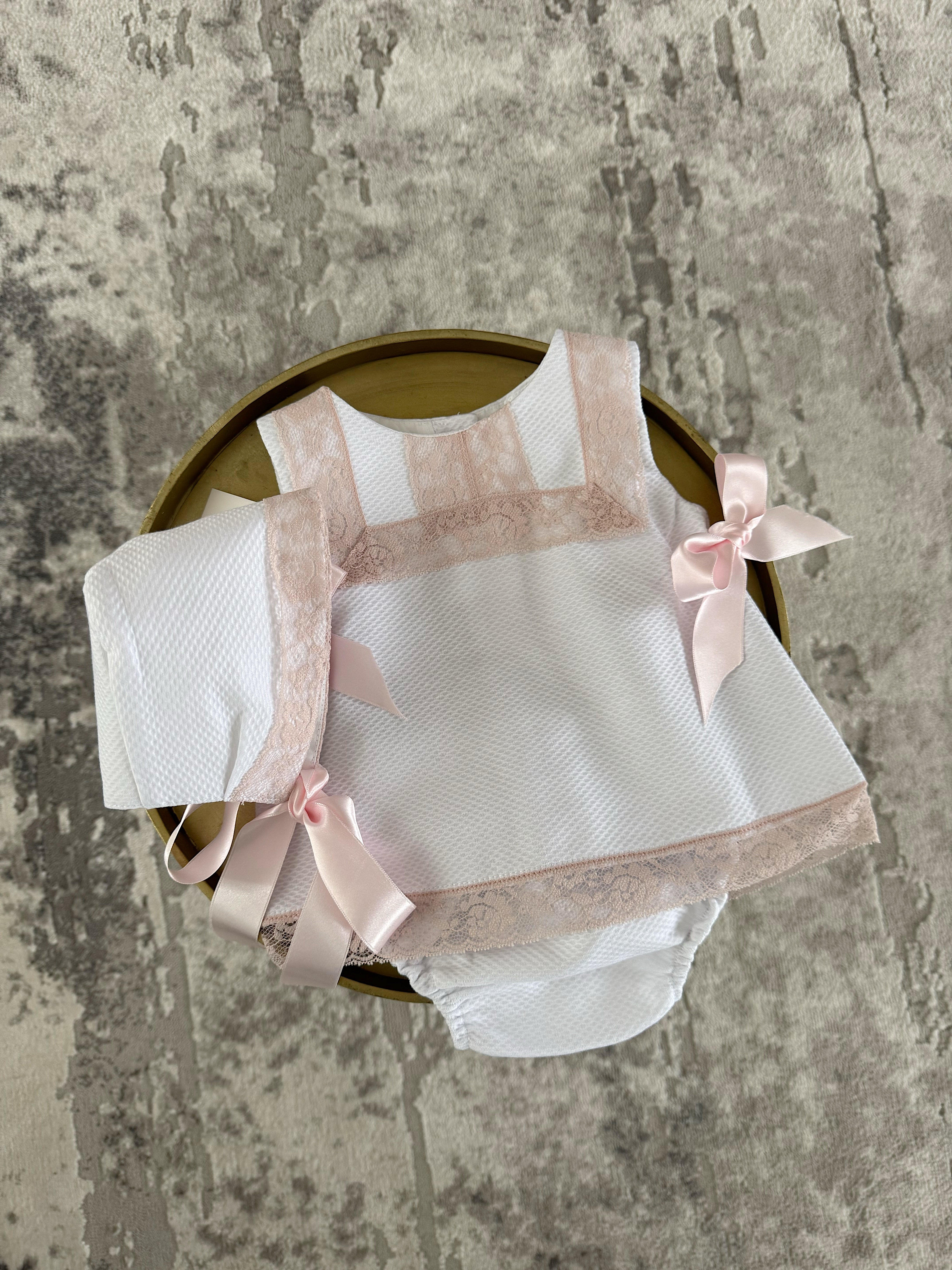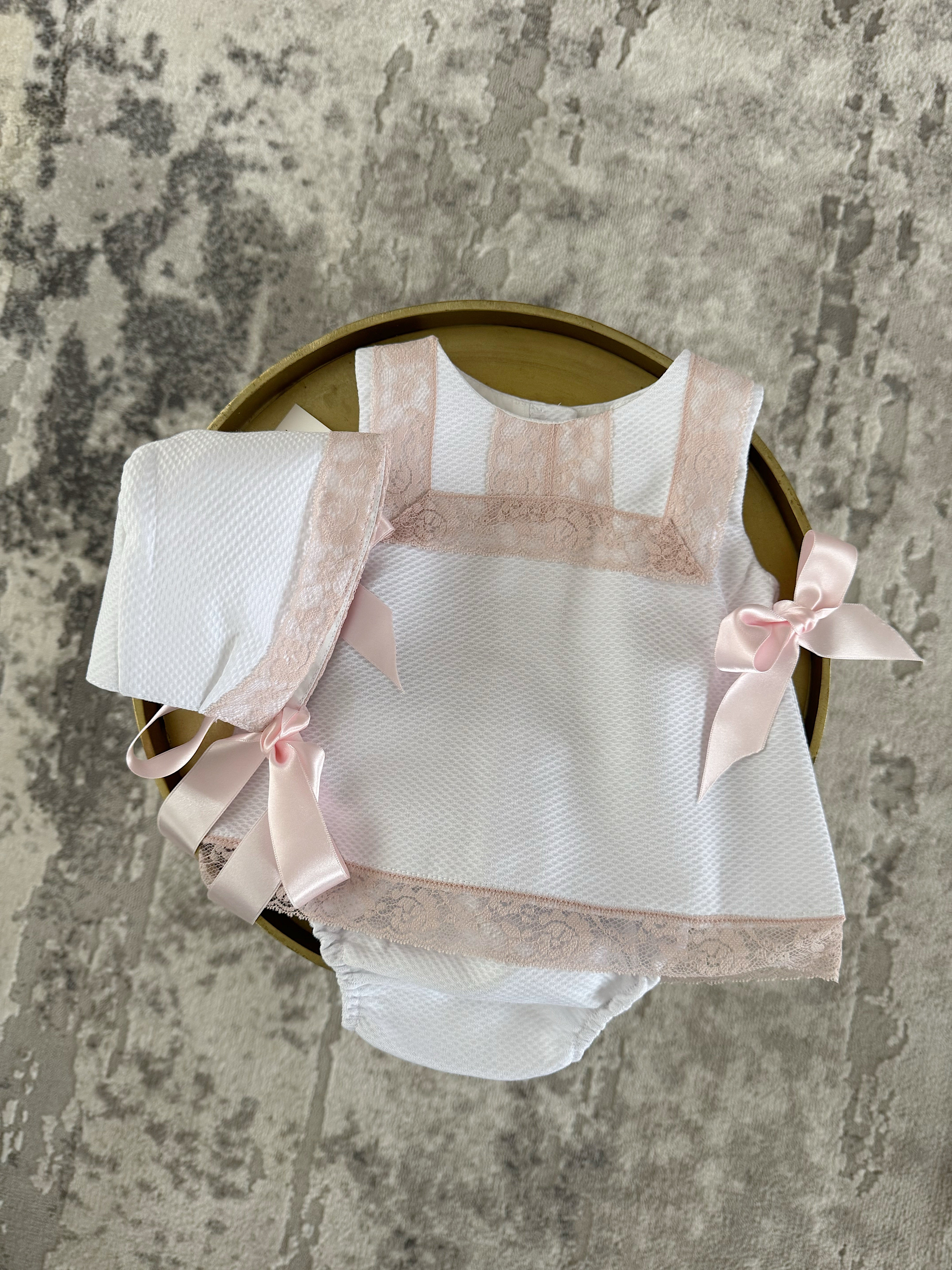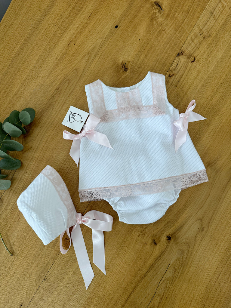 MI LOVES White Dress/Bonnet/Bloomers 3 piece set with beautiful dusty pink lace details