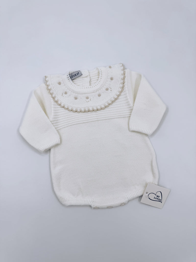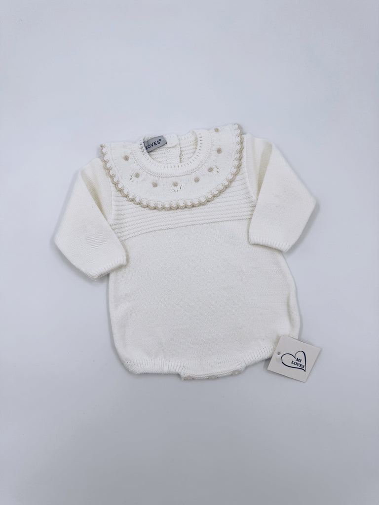 MI LOVES ivory knitted baby romper with cream trim on the frill.