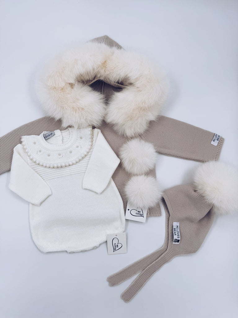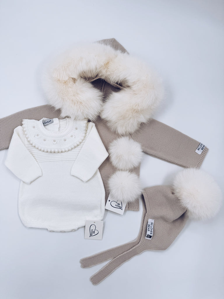 MI LOVES ivory knitted baby romper with cream trim on the frill
