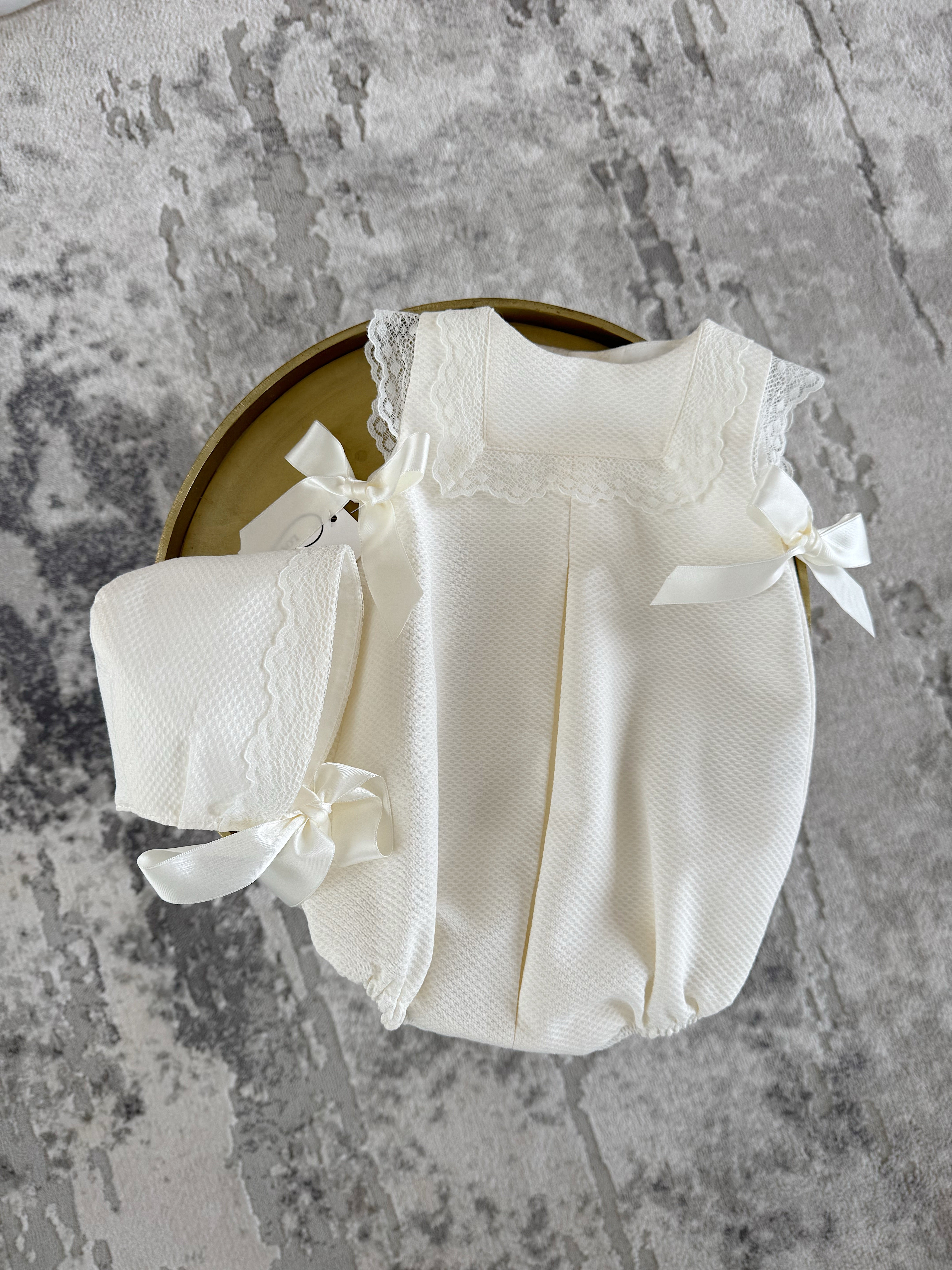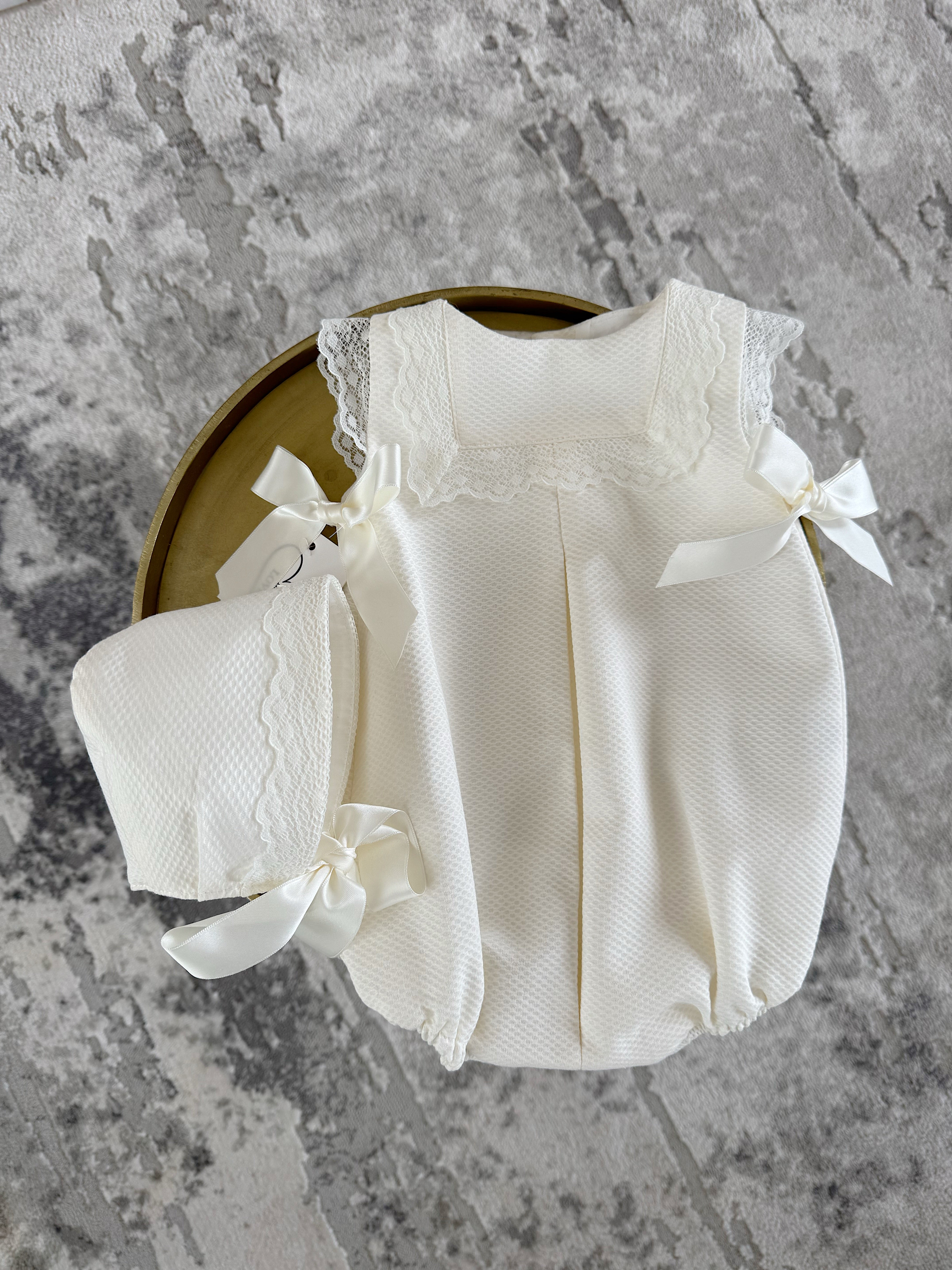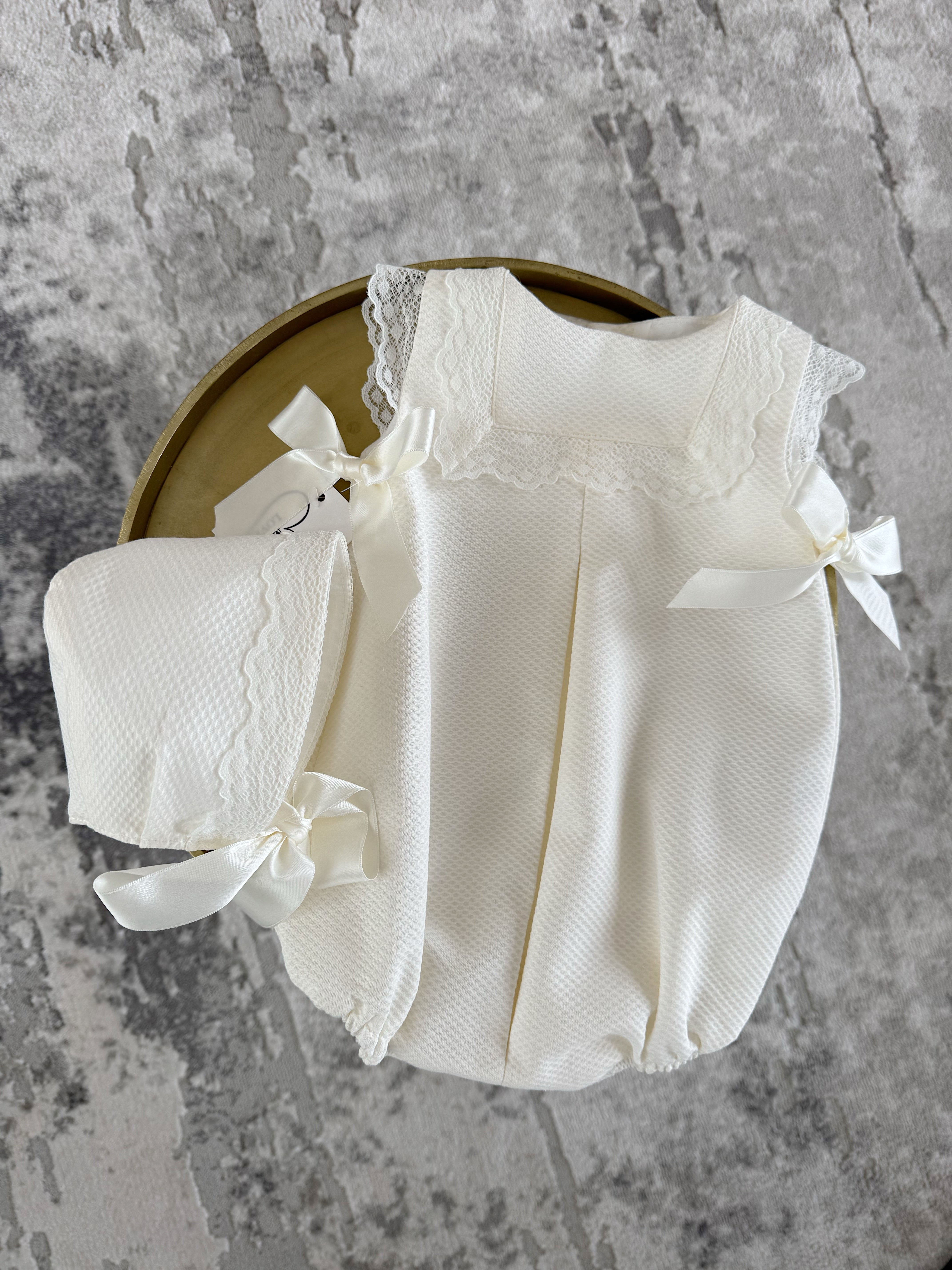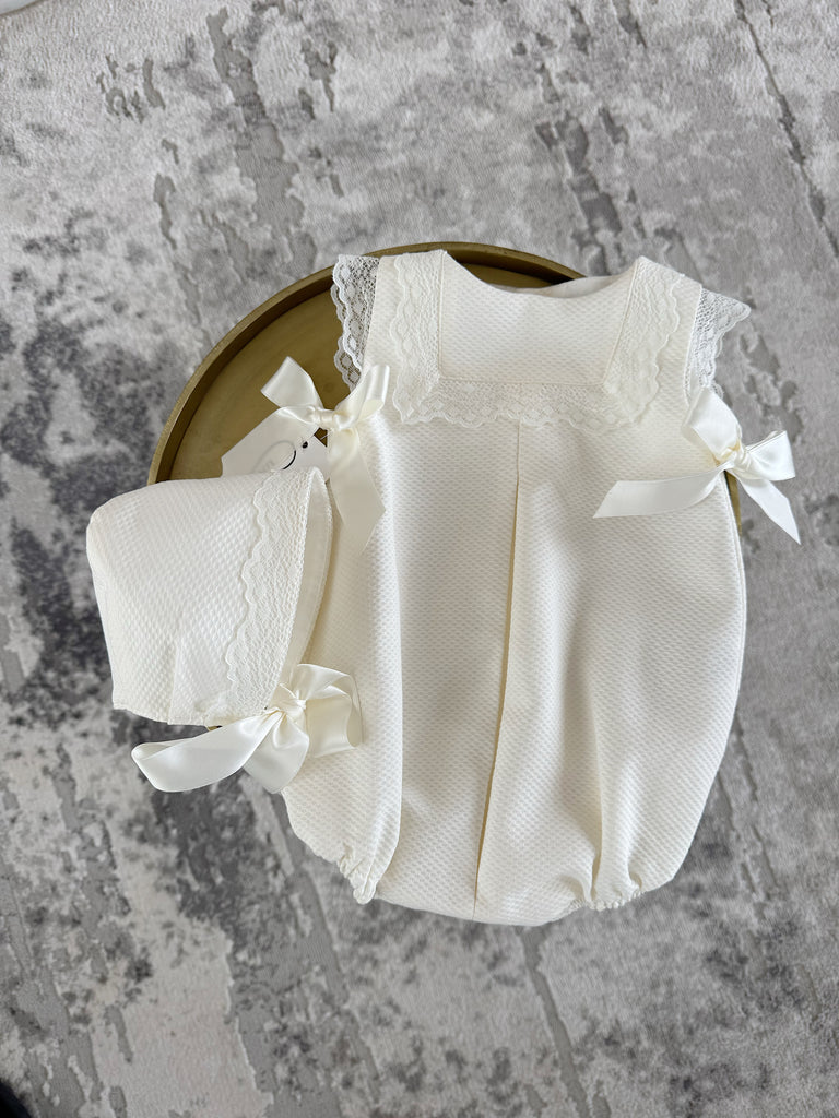 MI LOVES Ivory Romper with lace trim and bonnet 2 piece set.