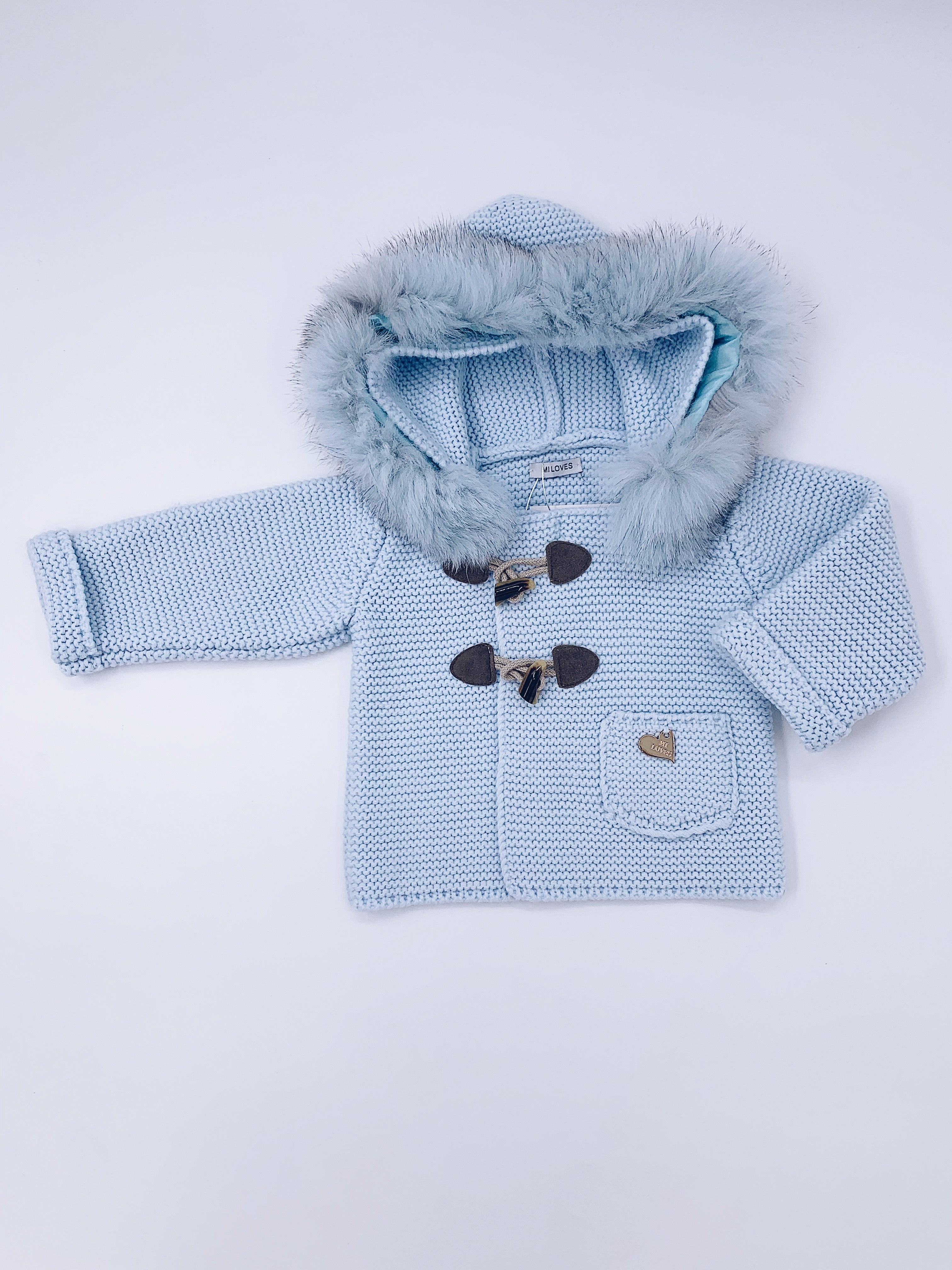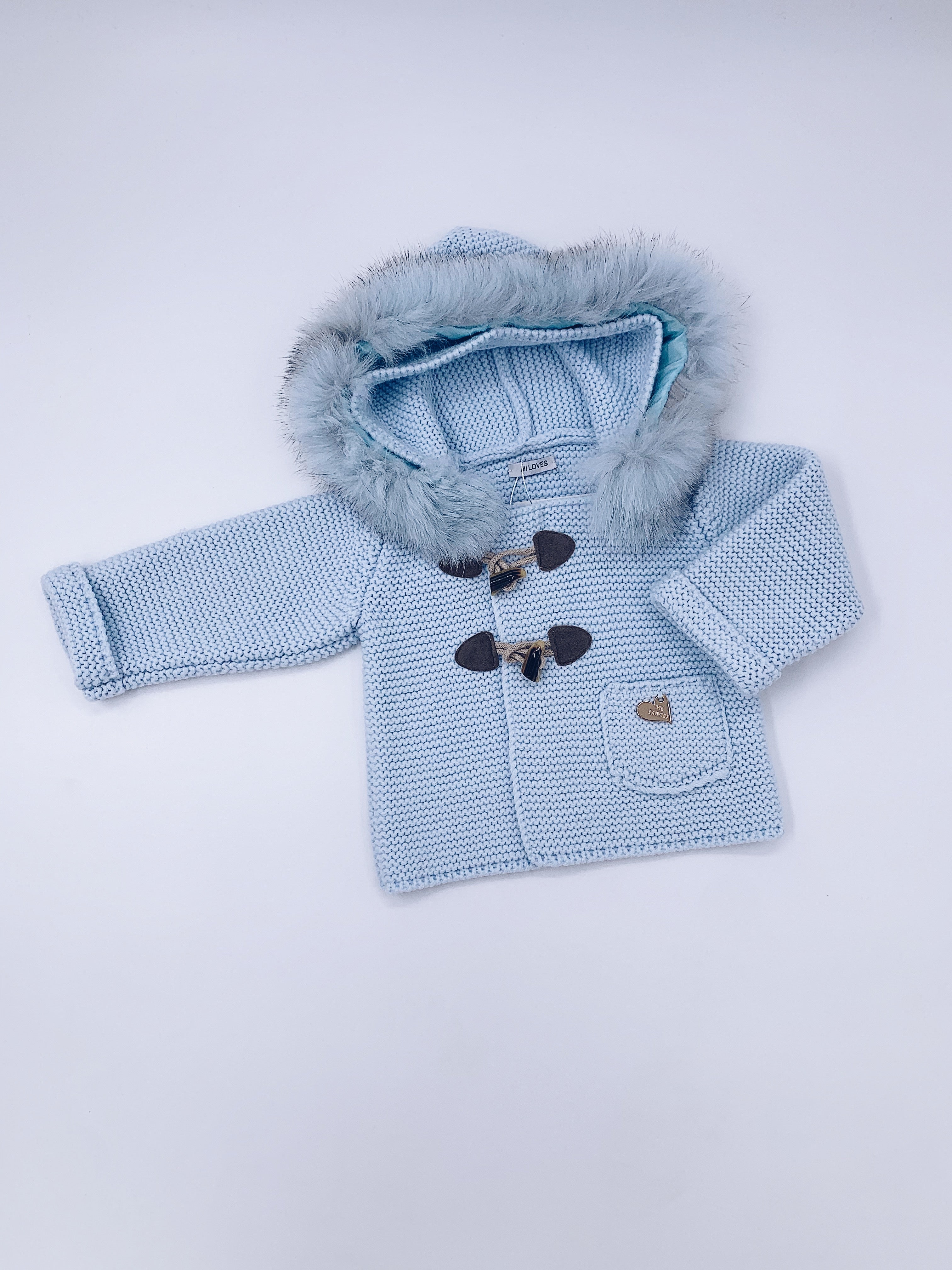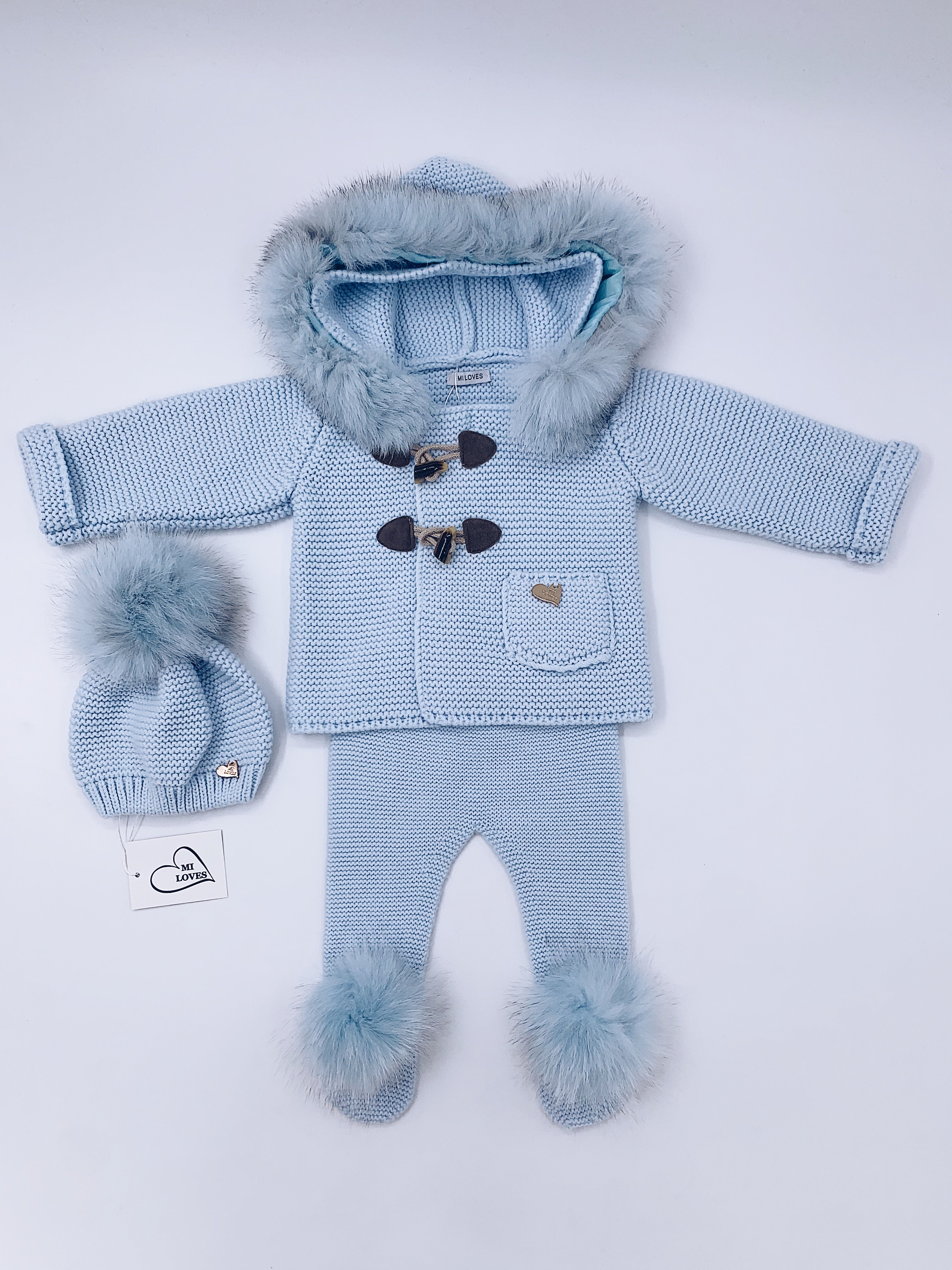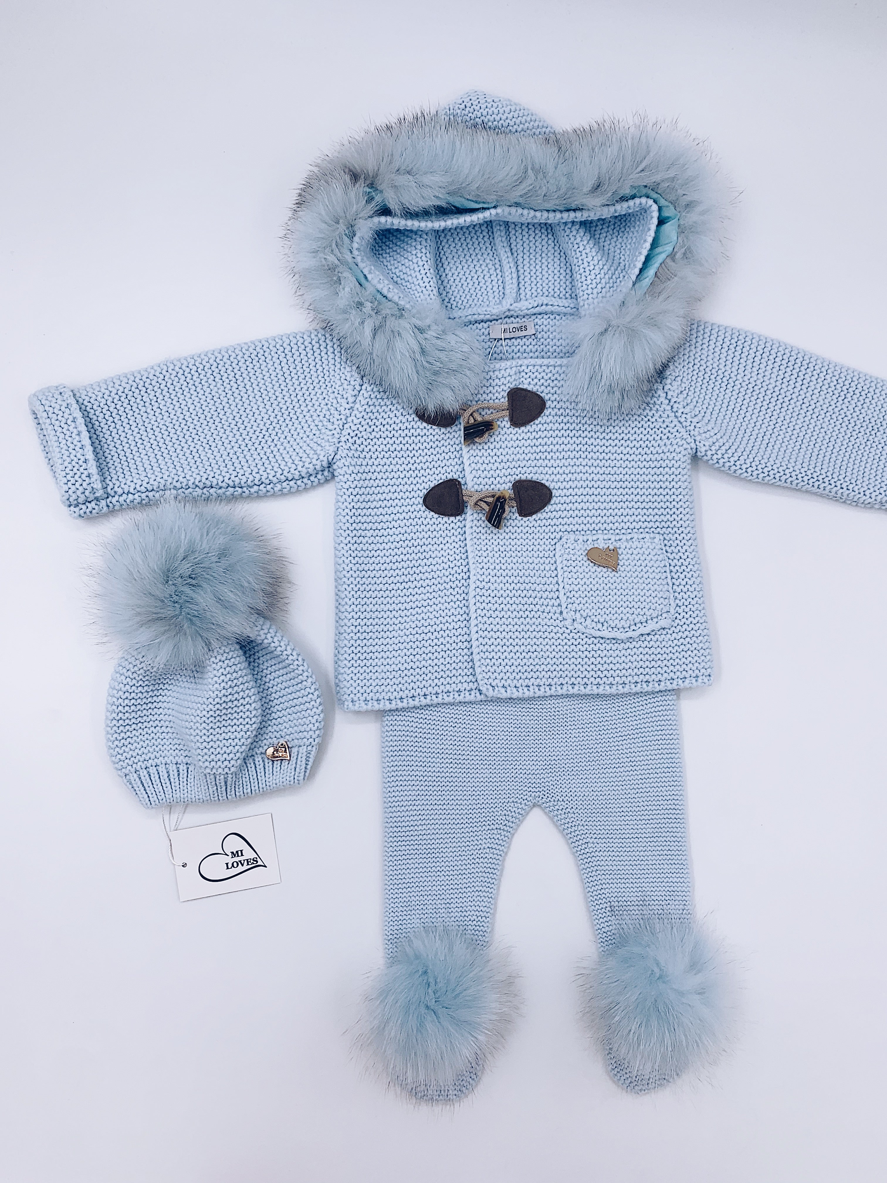 MI LOVES SIGNATURE Luxurious Fox fur trim Knitted Cardigan in Baby Blue .Matching Trousers,Leggings and Hat Sold separately and available on the website.