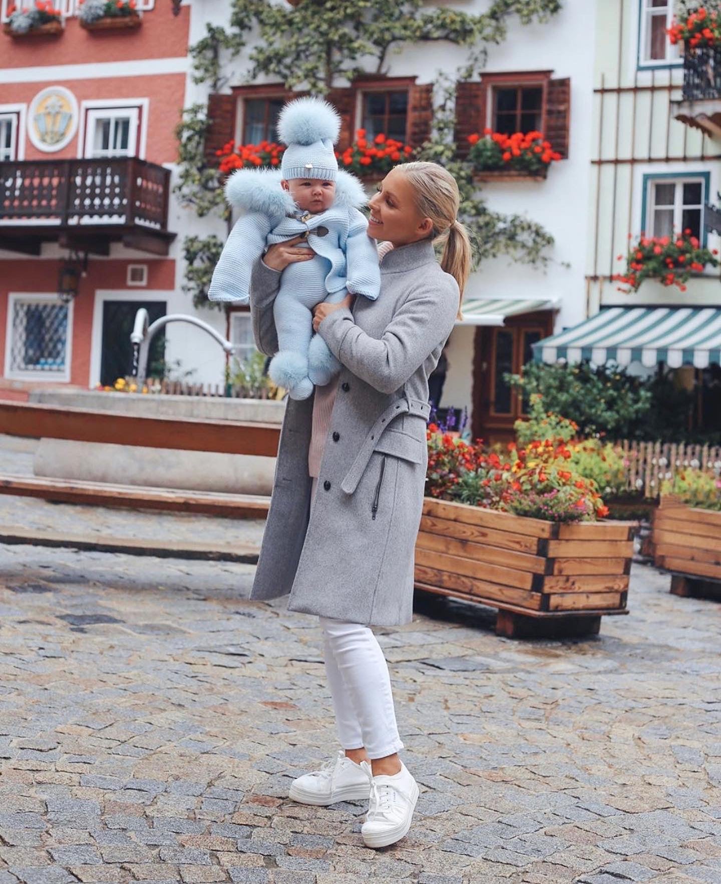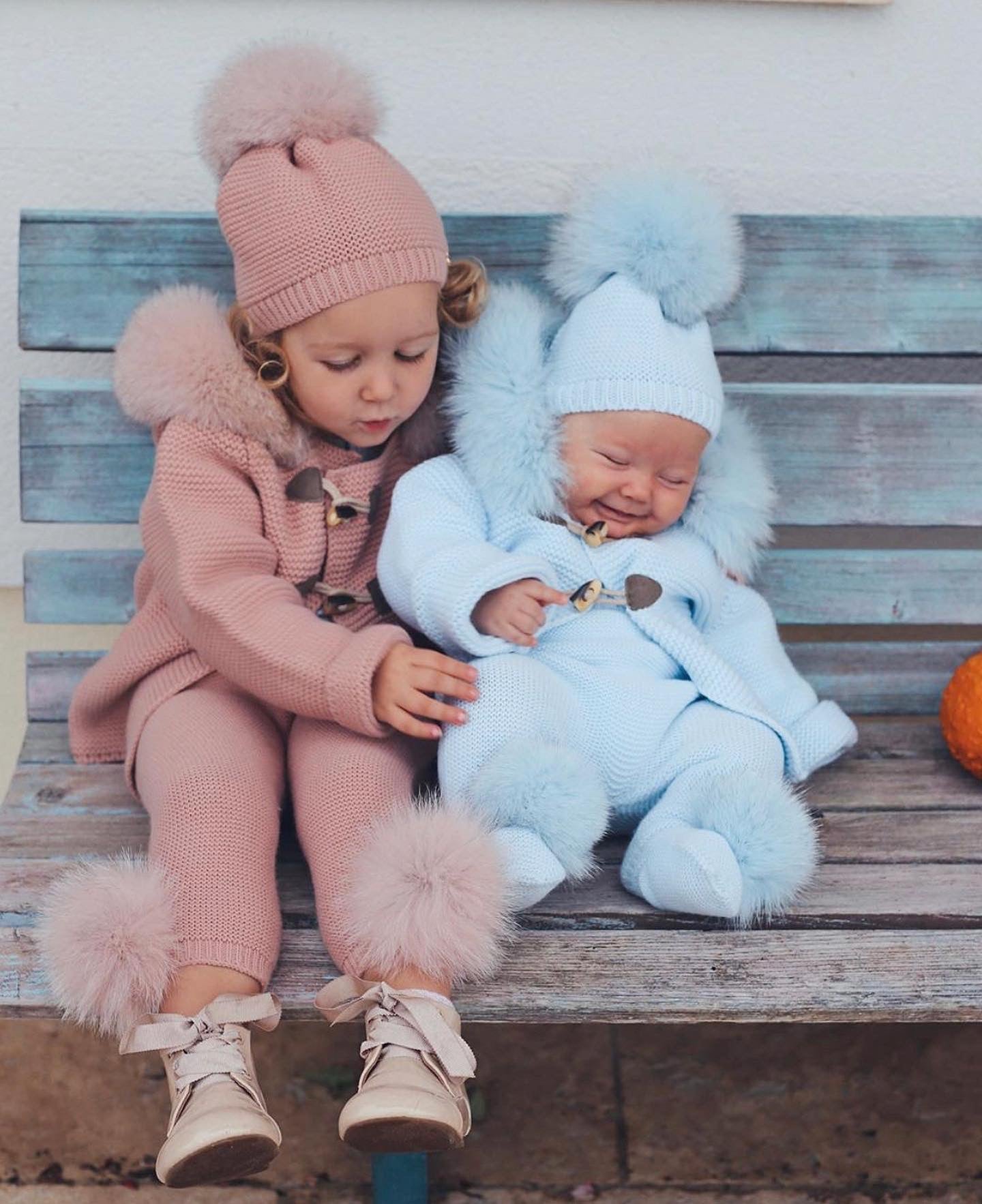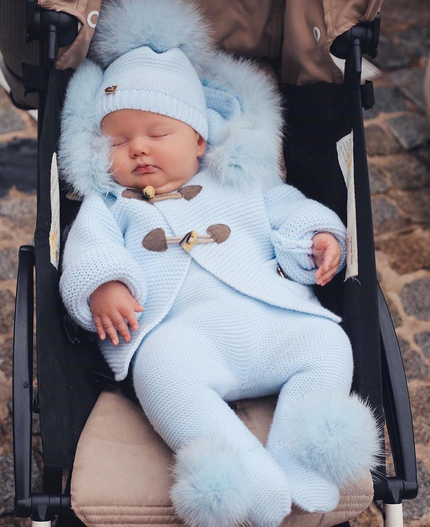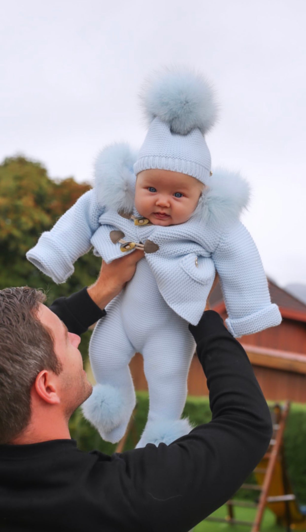 MI LOVES SIGNATURE Luxurious Fox fur trim Knitted Cardigan in Baby Blue .Matching Trousers,Leggings and Hat Sold separately and available on the website.