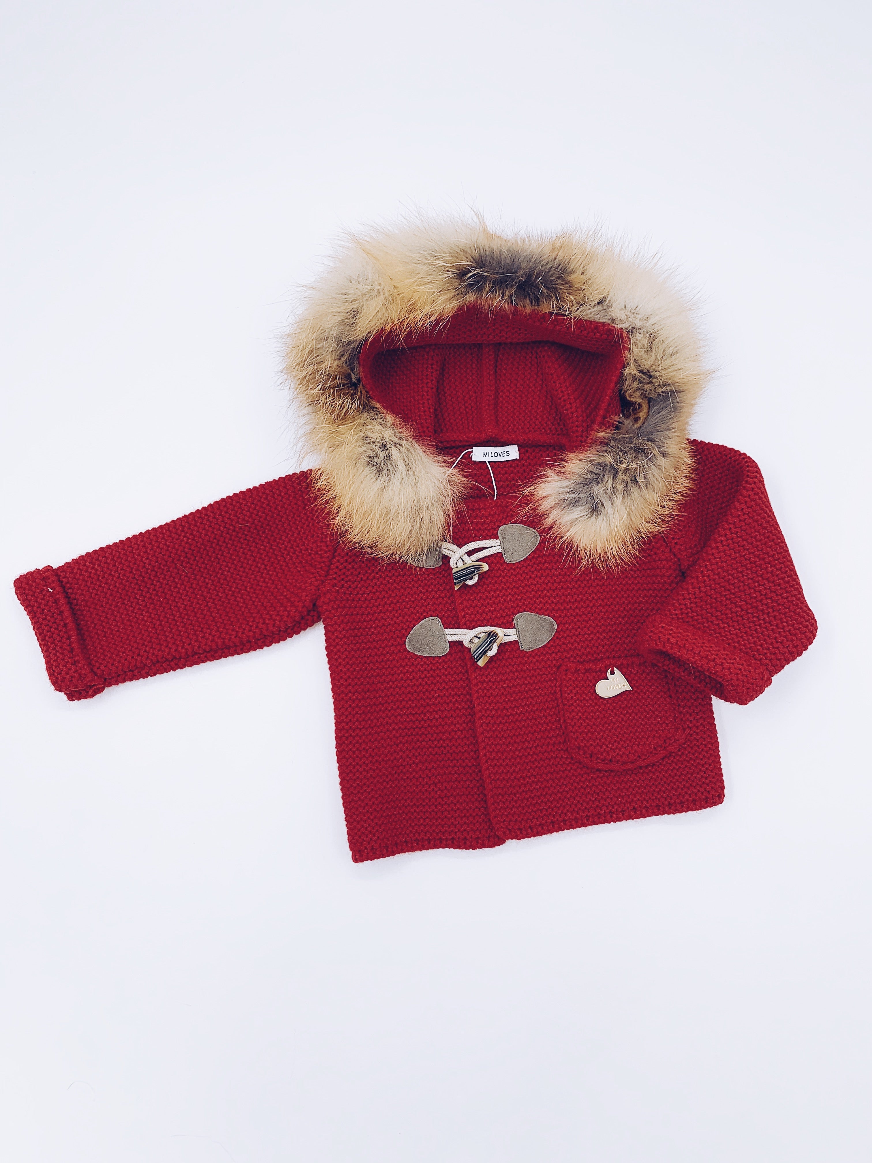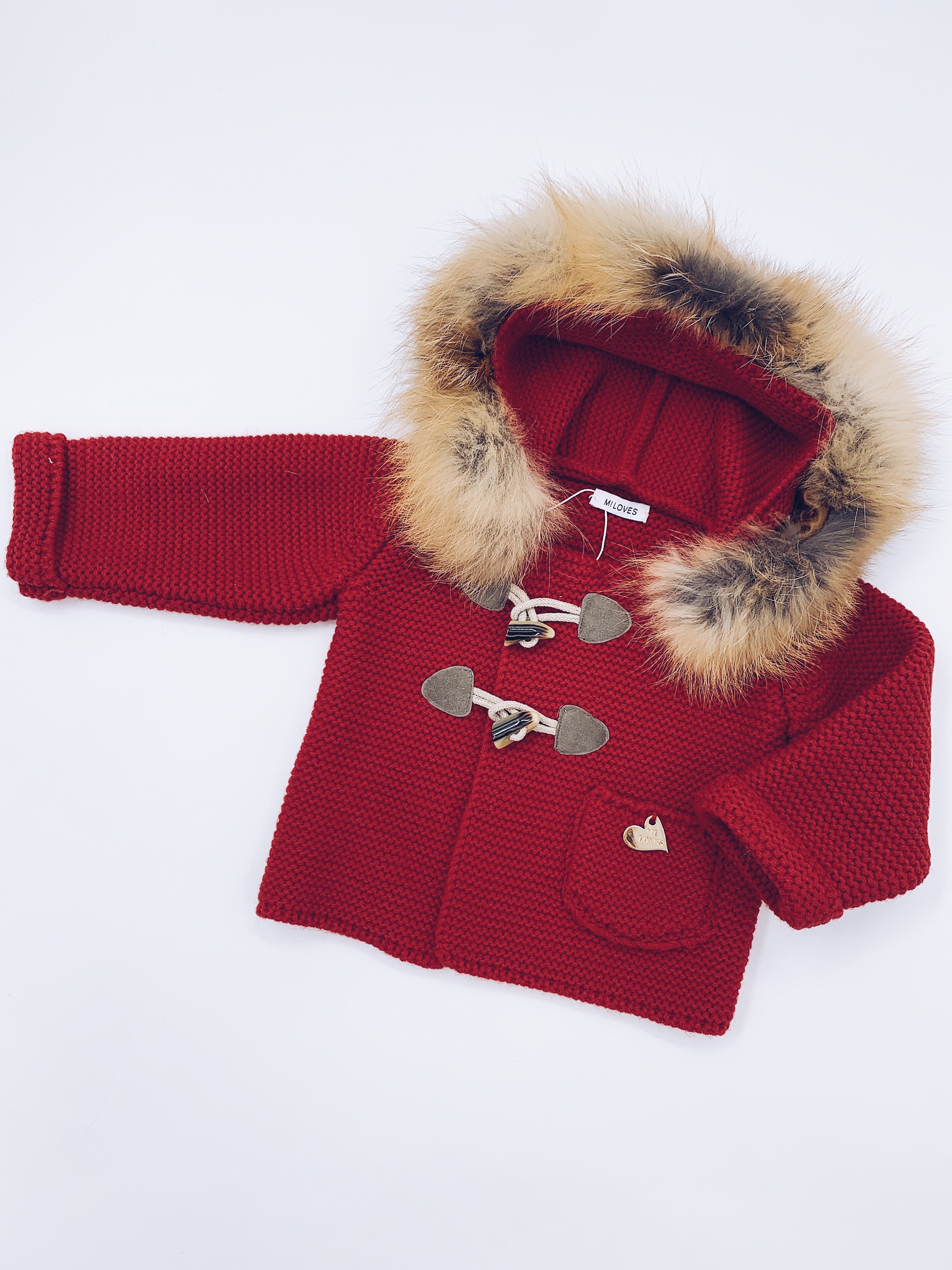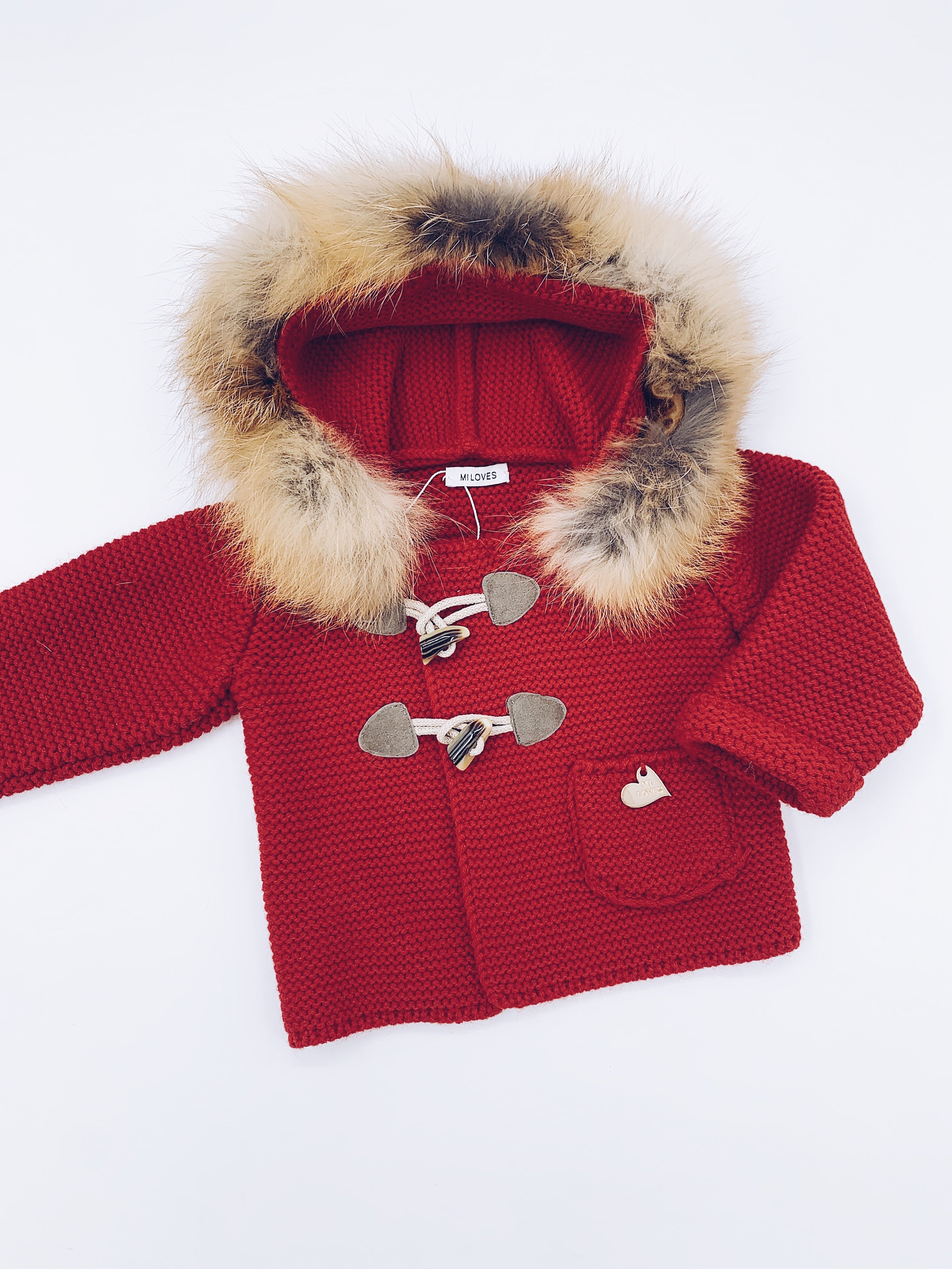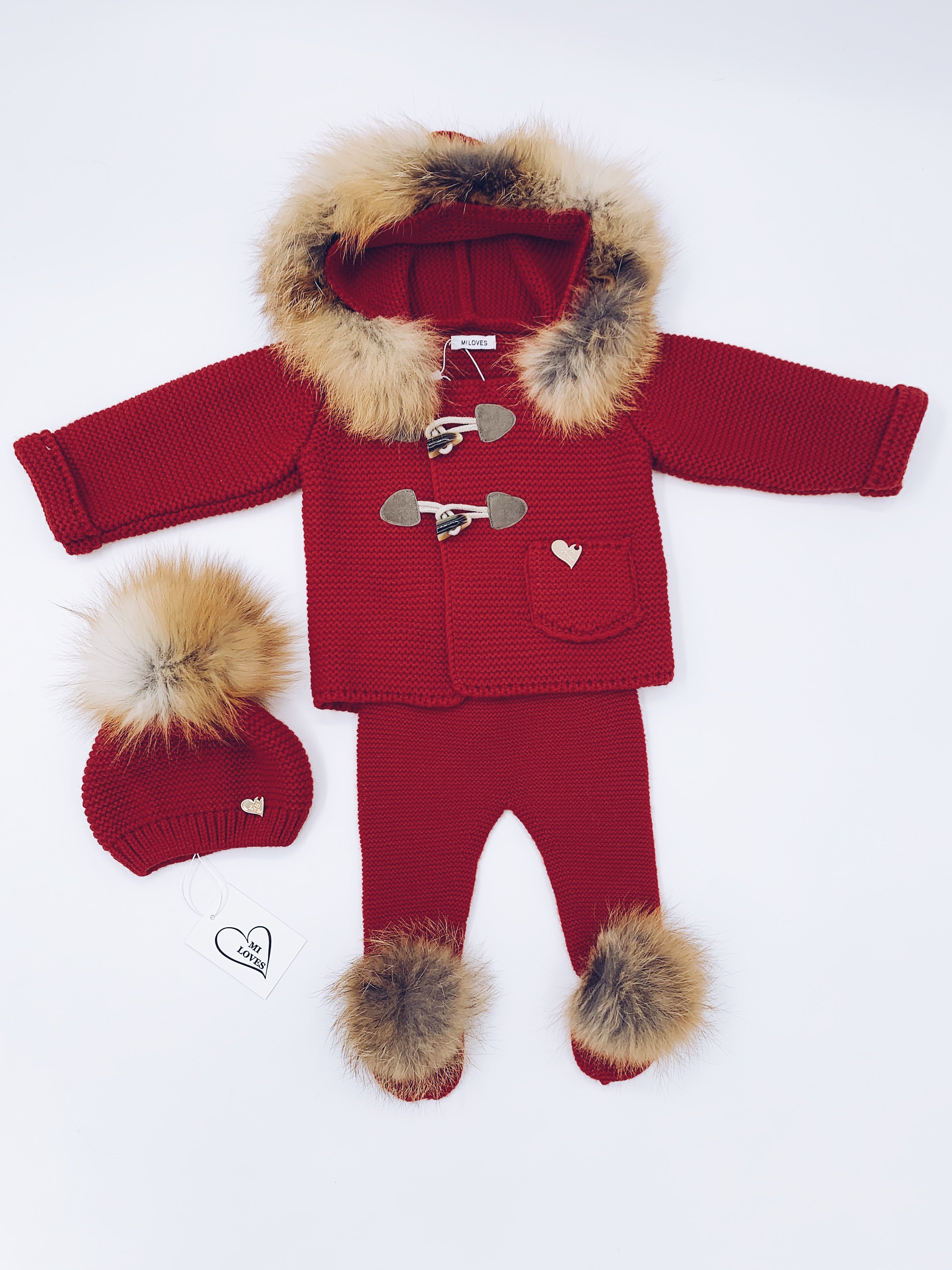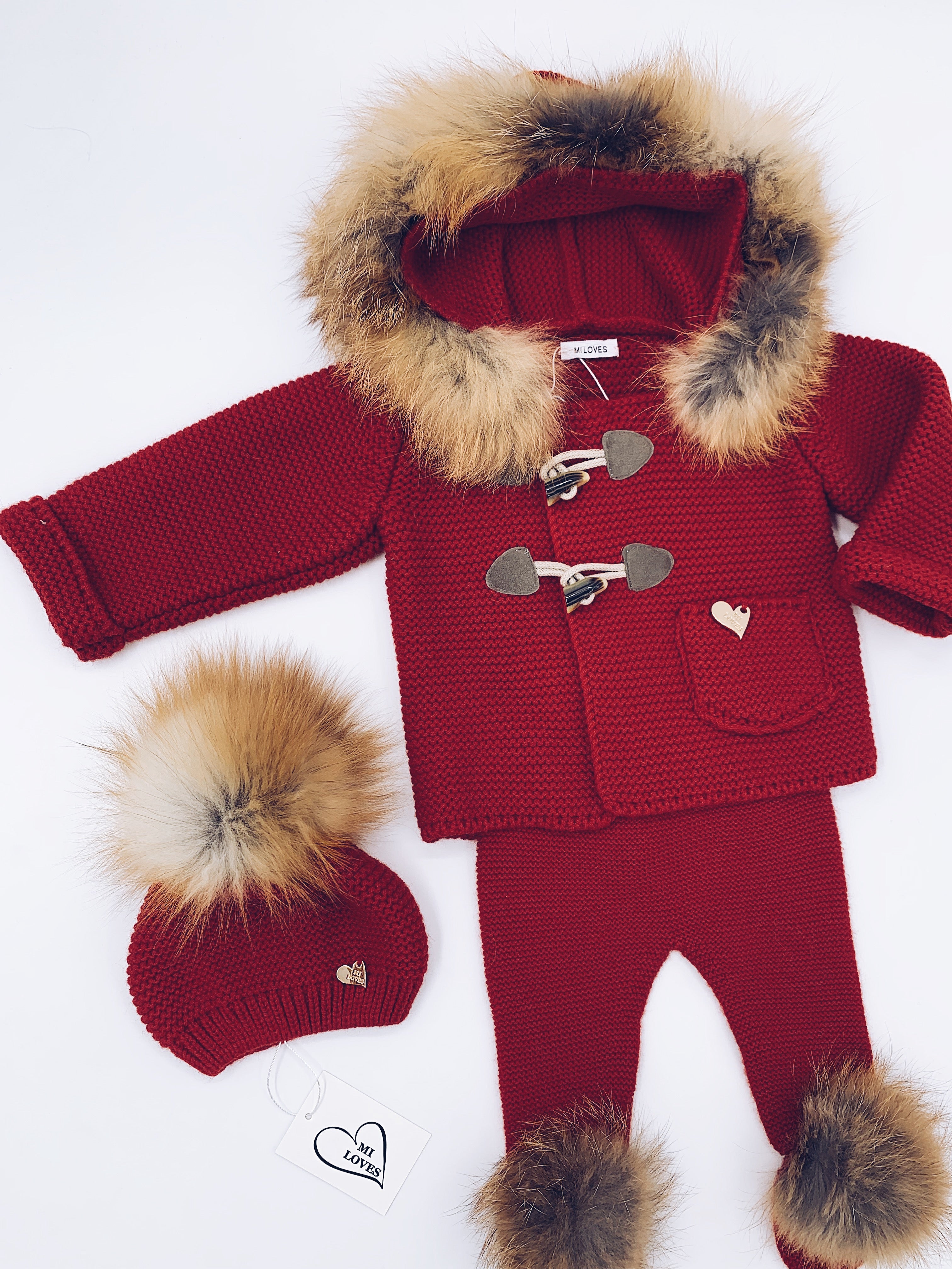 MI LOVES SIGNATURE Luxurious Fox fur trim Knitted Cardigan in Red .Matching Trousers,Leggings and Hat Sold separately and available on the website.