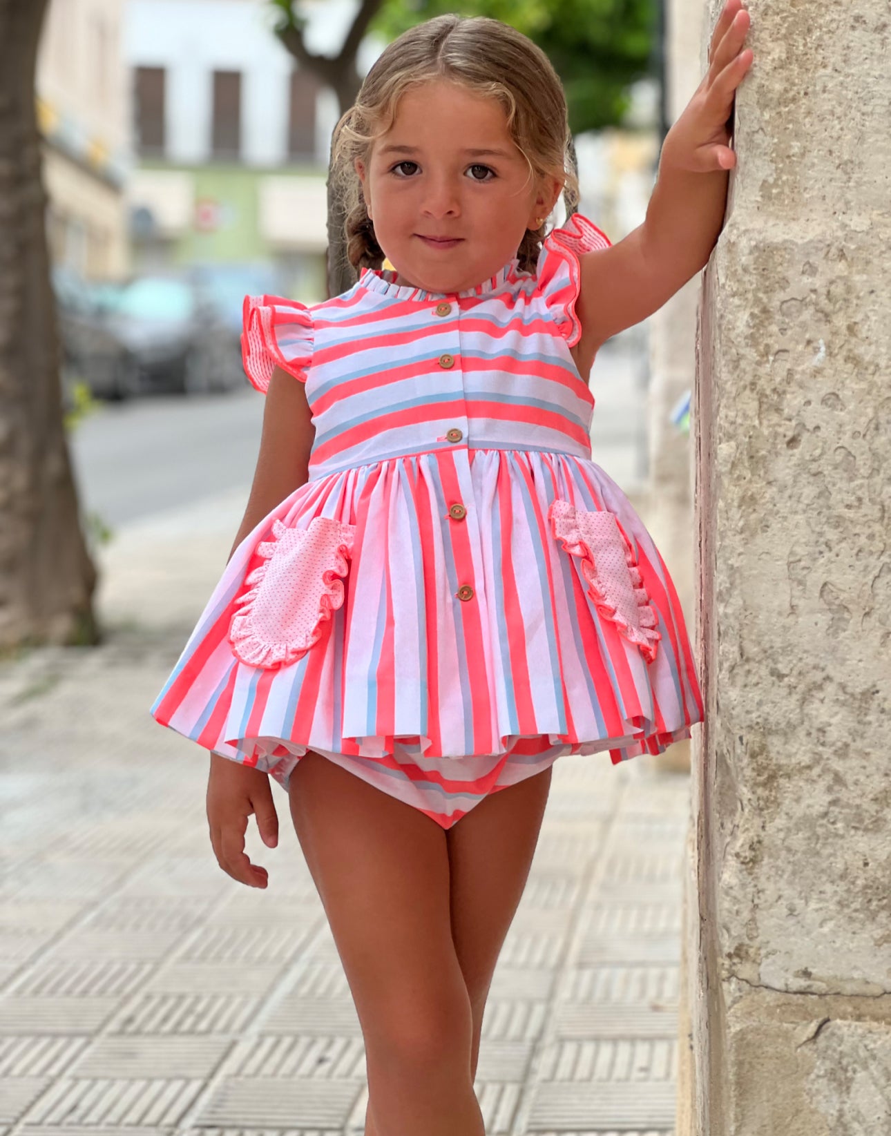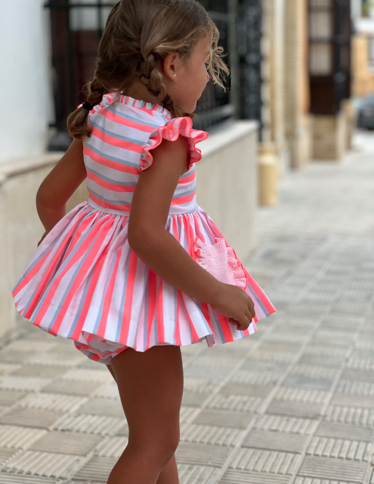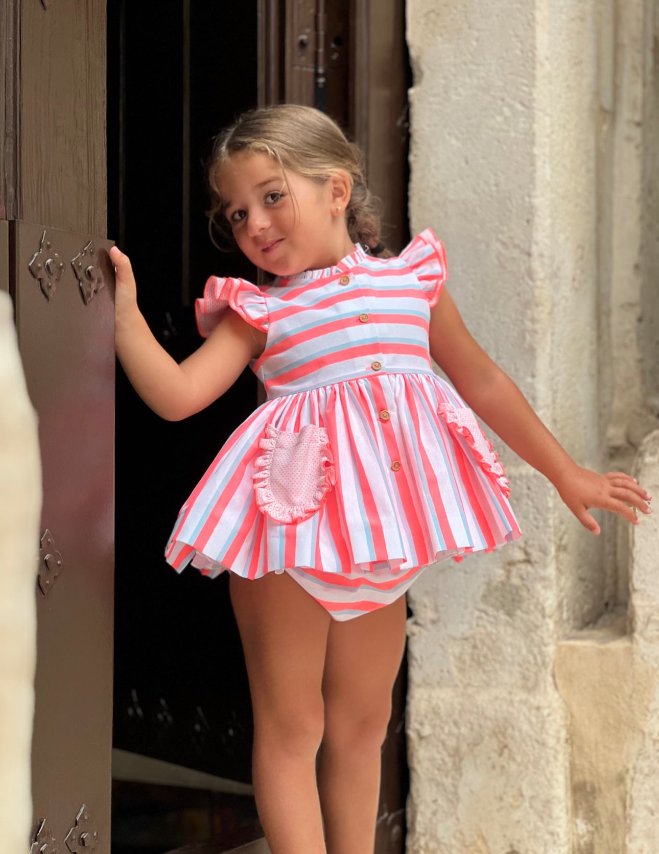 MI LOVES SIGNATURE pink Stripe Neon Dress and bloomers set with bow details.