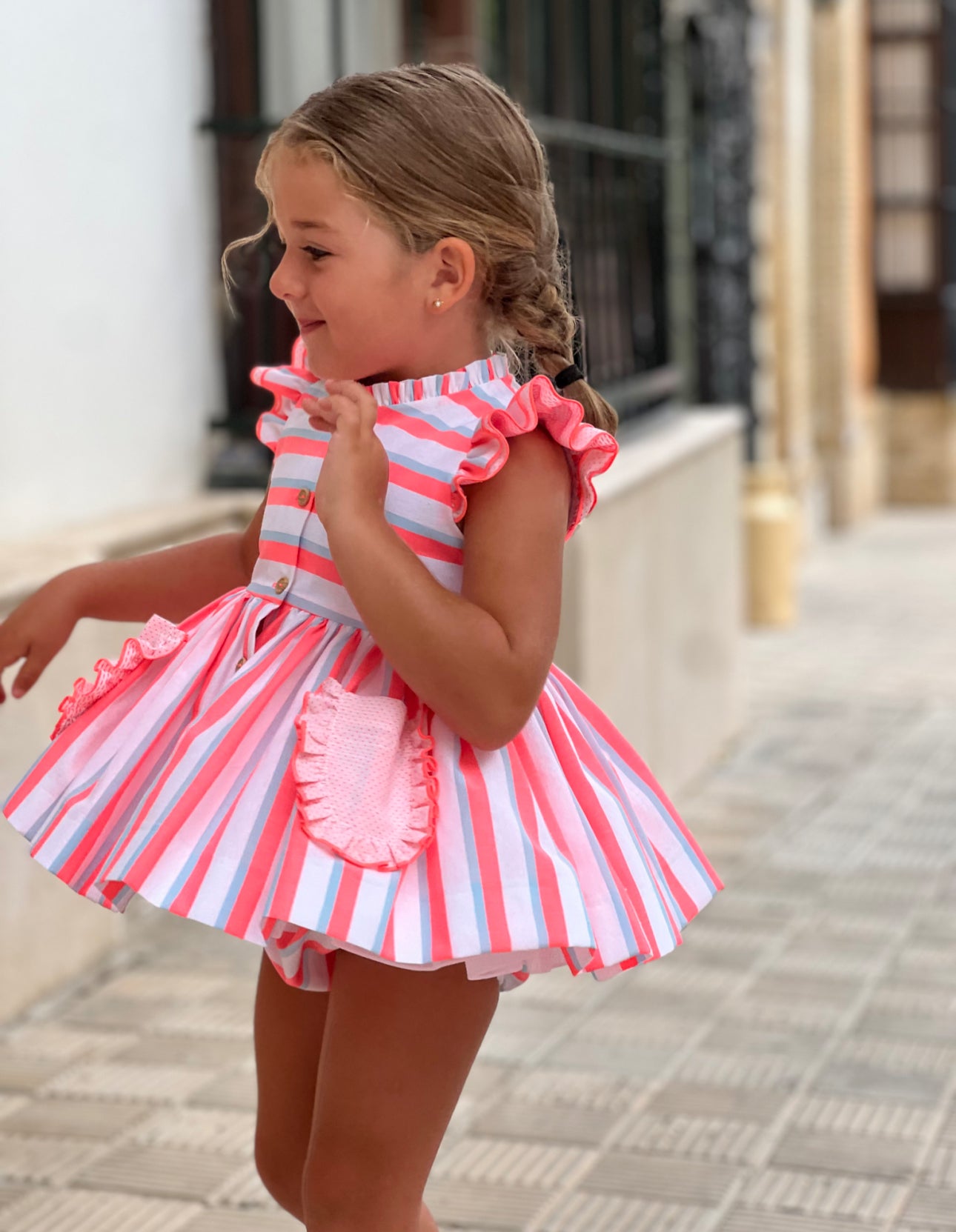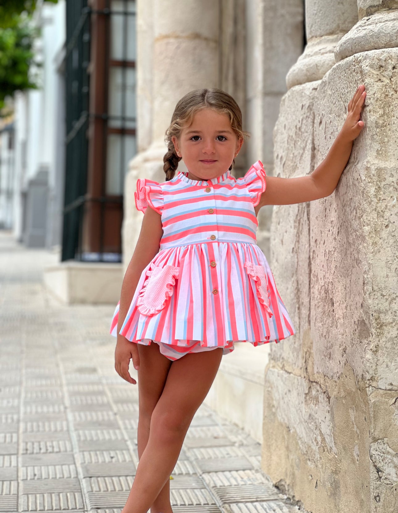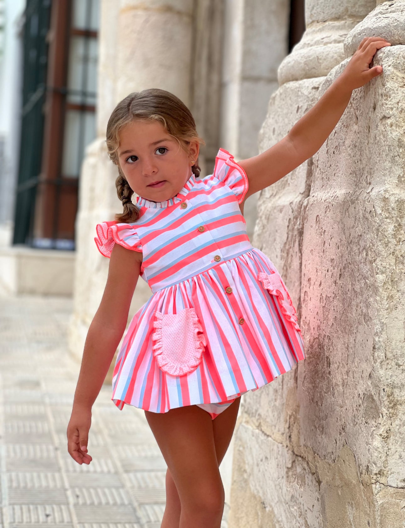 MI LOVES SIGNATURE pink Stripe Neon Dress and bloomers set with bow details.