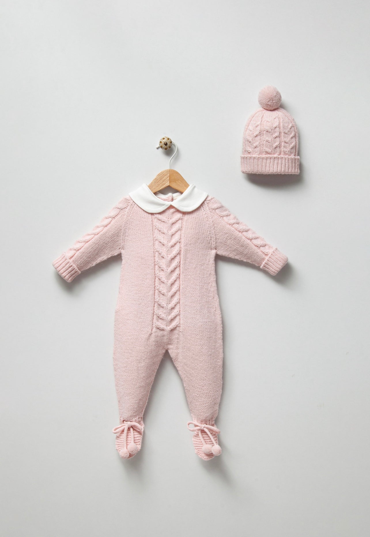 Beautiful Pink Knitted Babygrow/Matching hat 2 piece set.